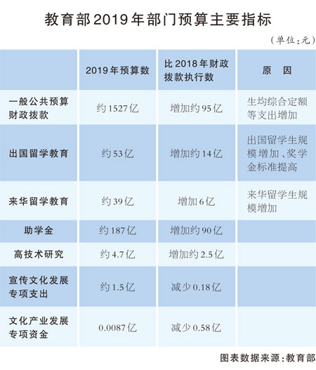 关于资金来源,教育部2019年部门预算显示,2019年一般公共预算财政拨款约为1527亿元,比上年执行数增加约95亿元。其主要原因为生均综合定额、出国留学经费以及学生资助工作专项等支出增加。